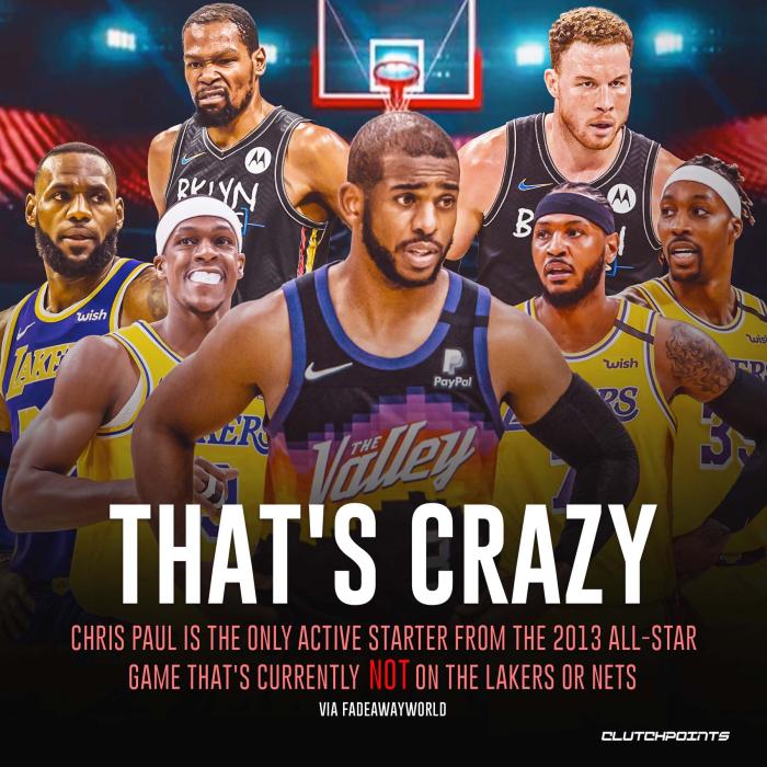 很明显,湖人和篮网都打造了一套新的豪华冲冠阵容,2011年全明星东西部首发,现役仅有保罗效力太阳,其他6人都效力湖人和篮网;有11位2015年的全明星为湖人和篮网效力(前提是阿德重返篮网)。