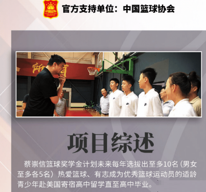 从今年开始,蔡崇信篮球奖学金开始独立运行,而中国篮协就是这一活动的官方支持单位。蔡崇信的篮球奖学金计划每年都会资助十名学生运动员到美国读高中,要求申请人的年龄必须在13-15岁之间,接受过2年以上系统的篮球训练。蔡崇信这么做只愿为中国篮坛培养和输送篮球人才,同时也能够加强中外青少年体育文化的交流。