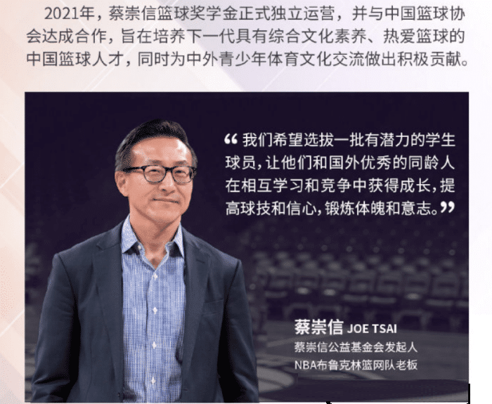 身为一名华人,蔡崇信也时刻牵挂着国内篮球事业的发展。近日蔡崇信篮球奖学金官方微博宣布,他们将助力国内篮球少年赴美留学。蔡崇信篮球奖学金官微表示,蔡崇信非常热爱体育事业,早在2019年篮协发起“中国篮球协会菁英计划”时,第一批的四名球员就是在蔡崇信的资助下在美国高中寄宿留学,篮协的菁英计划其实正是蔡崇信篮球奖学金的前身。
