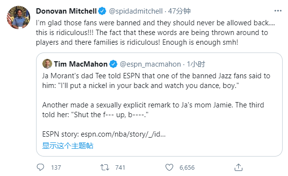 对于这件事,灰熊球星莫兰特回应,他的家人应该为灰熊欢呼;目前爵士球星米切尔也发声了,他发推写道:我很高兴那些球迷被无限期禁赛,他们应该永远都不被允许回来;这事也太离谱了,他们对球员以及其家人所说的话简直太离谱了,我真的受够这些了!