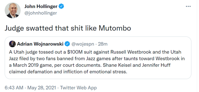 JRS直播网讯 北京时间5月28日,据名记沃纳罗斯基报道,一位犹他的法官驳回了两位球迷对威斯布鲁克和爵士高达1亿美元的索赔。这两位球迷曾在2019年3月的一场比赛中和当时效力雷霆的威少发生争吵。随后,他们俩已经被爵士禁止现场观赛。两位球迷随后提出诉讼,把威少和爵士告上法庭,理由是自己受到了诽谤与精神困扰。