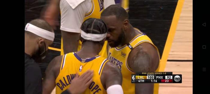 我们再看看湖人队这边,在对阵太阳队的关键时刻,詹姆斯突破将球传给了空位的波普,本场比赛在三分线上4投0中的波普对于自己的投篮产生了怀疑,这让处于空位的他开始犹豫。