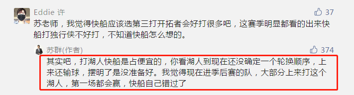 有球迷认为,快船队应该选第三,首轮打开拓者的话会好很多。而苏群老师回应,其实快船打湖人是占便宜的,湖人到现在还没有固定的轮换,上来就输球,摆明了就是没准备好。大部分球队上来打湖人,第一场都会赢,快船自己错过了这个机会。