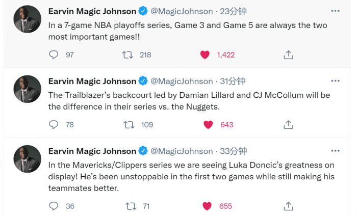 JRS直播网讯 北京时间5月27日,尼克斯主场击败老鹰扳回一城,76人则是大胜奇才将系列赛大比分改写为2比0!湖人名宿魔术师约翰逊向来喜欢在社媒上发表自己对比赛的看法。而就在刚刚,魔术师一下连发了7条推文!