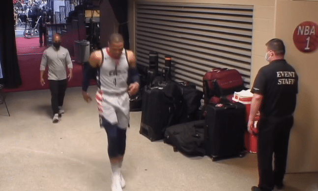 JRS直播网讯 北京时间5月27日,奇才和东部第一系列赛G2,场上多次出现受伤事件,末节威少脚踝受伤,一瘸一拐返回更衣室,离场时在球员通道入口处,威少被现场球迷激怒,情绪失控一副要揍人的样子,几个大汉才拦住他。