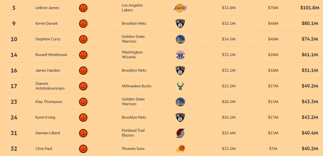 5.詹姆斯(1.018亿)、9.杜兰特(8010万)、10.库里(7450万)、14.威斯布鲁克(6110万)、16.哈登(5110万)、17.字母哥(4920万)、23.克莱-汤普森(4330万)、24.欧文(4320万)、31.利拉德(4040万)、32.保罗(4020万)。