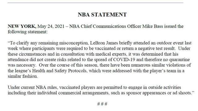 事件回放:湖人与勇士的比赛前夕,NBA巨星詹姆斯与德雷克、迈克尔等影视界名流参加了集会,主要为詹旗下的产业——品牌龙舌兰酒进行“商业互吹”活动,不过詹皇却没按规定办事,甚至连口罩都不戴。据悉,老詹的行为明显违反了NBA的健康条例,按规矩应被处罚,甚至存在禁赛的可能。不过据最新消息来说,NBA大佬迈克·巴斯却出来发言,他表示老詹虽违规了,但参与者都接种了疫苗或通过了健康检测,因此詹皇的行为不会对大家的健康安全产生不良影响,故他不用隔离,也不会被禁赛。