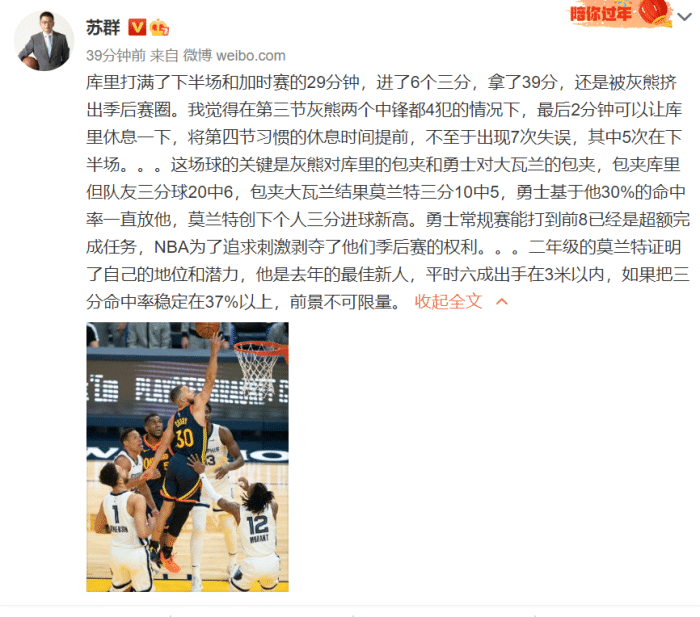比较理性的是王猛,他作为本场的解说赛前就说勇士压力大,不好打,并且说他们第一节可能就会占得先机,果不其然。的确是青春风暴,没包袱没压力,上去就是拼!瓦兰和杰克逊受到伤病困扰又如何,他们有领袖莫兰特,替补席上站出来的二轮秀蒂尔曼也丝毫不怵。