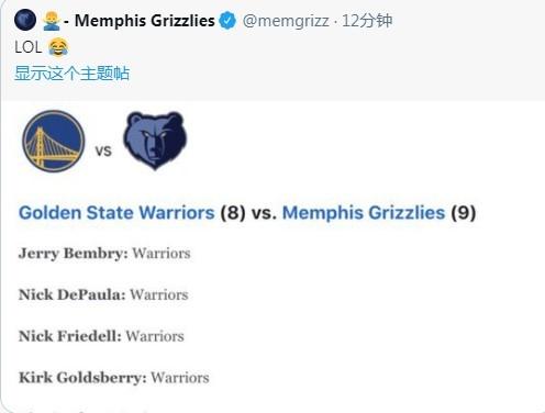 赛前没人看好灰熊,一股脑地支持勇士,但俗话说“大热必死”,勇士在主场反而压力更大!赛后灰熊官推转发了此前专家们对该场附加赛的预测数据,并写道:“笑哭。”其中,16名专家预测勇士获胜,只有1名专家预测灰熊晋级。不仅仅是外国名嘴,我们国内名嘴也大多支持勇士,甚至预言他们会黑八!