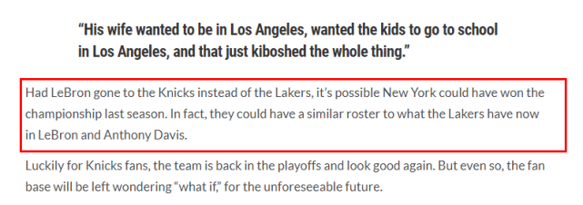clutchpoints指出,如果詹姆斯在2018年去了纽约而不是洛杉矶,上赛季拿到总冠军的本该是尼克斯。毕竟,他们完全可以打造一套和湖人相似的阵容,特别是浓眉,他加盟湖人,也是冲着詹姆斯而来。