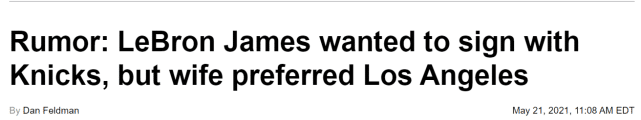 “我们听说勒布朗本来想去的是纽约,关于这个消息,我有非常好的消息源。他一直考虑去纽约,但他的妻子想去的地方是洛杉矶。她想让孩子们上洛杉矶的学校,那阻止了詹姆斯原来的计划。”