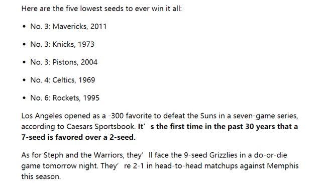 官网直言,在一轮系列赛里,7号种子比2号种子更被看好,确实有点奇怪。詹姆斯表示:“湖人是上赛季的总冠军,因此每支球队都想击败我们,我们得知道这一点,对太阳的系列赛我们要打得比现在更好一些。”官网预测湖人6战胜出。