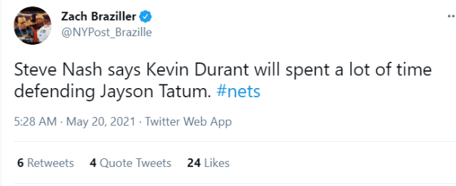 比赛的结果都是篮网获胜,但纳什不敢掉以轻心。他强调,凯尔特人是一支非常出色的球队,他们需要时间来好好备战。谈到塔图姆时,纳什表示,杜兰特会有大量时间去盯防这位绿军的头号得分手。