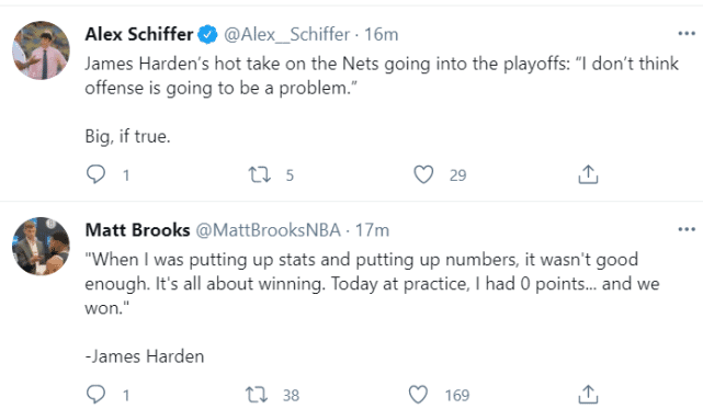 谈到篮网的季后赛之旅,哈登表示:“我认为进攻不是问题。”哈登还谈到了自己拿到太高的分数,不是什么好事。“当我的数据不断增加时,那就是我们还不够好,一切都在于胜利。就像今天的训练赛,我得了0分,但我们这一方赢了。”