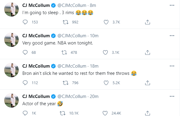 现役球员、开拓者球星麦科勒姆也表示:“很好的比赛,联盟今晚赚大了。”