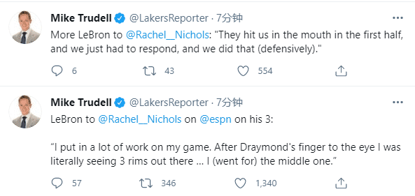终场结束,詹姆斯左眼依旧不能完全睁开,当时湖人队医给他滴了一点滴眼液;赛后詹姆斯回应此次被格林犯规,他表示:我在比赛中花了很多时间,被格林的手指戳到眼睛后,我真的看到场上有三个篮筐。