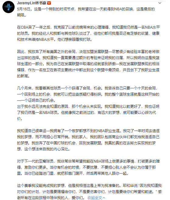 JRS直播网讯 今天林书豪在社交媒体上的一篇长文吸引了很多人的关注,称自己为了重返NBA,放弃了美国之外的一切合同,而且在发展联盟也打出了不俗的表现,自己只是需要一个证明的机会,哪怕是10天的短合同,一直到常规赛结束,都没有能够实现,林书豪不解为何无法重返NBA。正如他说到的一样,自己的表现比以往更好了,却依旧和NBA无缘了。最后林书豪也感谢了自己在冲击梦想时期一路陪伴的人。