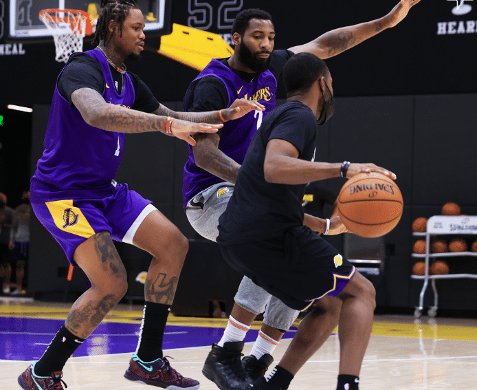 可以看出,德拉蒙德和麦科勒莫两人,在训练中演练包夹战术,迫使进攻球员到右侧45度角,这样严密的防守,除了传球,也没有其他的办法。不过,湖人需要在比赛中,注意避免不必要的犯规,一旦陷入犯规危机,比赛走势可能就会改变。