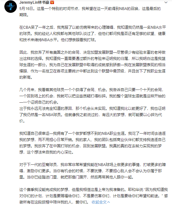 JRS直播网讯 今天林书豪在社交媒体上发布长文,称本赛季重返NBA的梦想已经破灭了,按照联盟的规定,常规赛结束、季后赛开始前还没有签约,就正式无缘本赛季的NBA了。对于林书豪来说,在发展联盟打了一个赛季,场均19.8分位居第7名,得分榜前11名中只有他没有得到NBA的合同,在长文中林书豪也表示了不理解,他只是想要一份10天的短约,但即便是这样的要求,依旧无法得到满足。