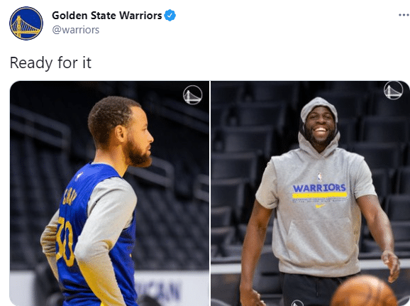 勇士官方晒出库里和格林站在斯台普斯球馆的画面,库里身穿勇士30号球衣,双手掐腰、表情和眼神十分专注;格林则是身穿连帽训练服,咧嘴大笑十分开心。
