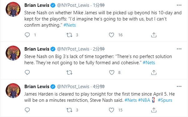 哈登伤愈复出,自从4月6日伤退之后首次重返赛场,纳什已经证实哈登将会出战,将会有出场时间的限制;谈到三巨头联手时间太少,纳什表示:这没有完美的解决方案,他们不会完全形成凝聚力。