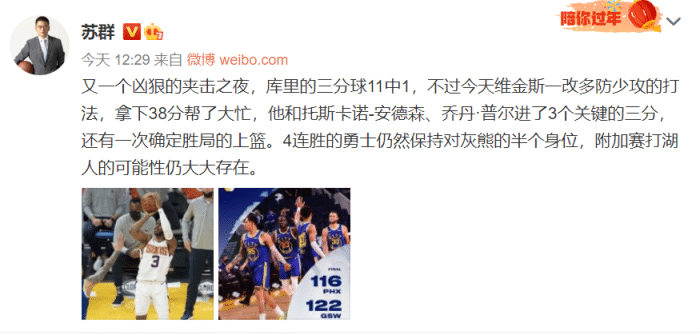 苏群点评这场比赛称赞了维金斯也分析了勇士目前的形势,他们领先灰熊半个胜场,很可能会与湖人打附加赛,也可能掉到第九!但不管怎么样,近期的4连胜连续击败强队的表现让我们有了信心,科尔赛后更衣室霸气演讲给球员增加季后赛以下克上的信心,库里则是带头大喊“1、2、3,只有我们”