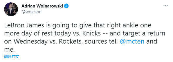 JRS直播网讯 据ESPN名记沃纳罗斯基报道,詹姆斯因右脚踝扭伤缺席今天湖人和尼克斯的比赛,但他计划明日在对阵火箭的比赛中复出;湖人冲击西部第六的利好,浓眉已经找回状态,詹姆斯也即将复出,詹眉终于又要合体了。