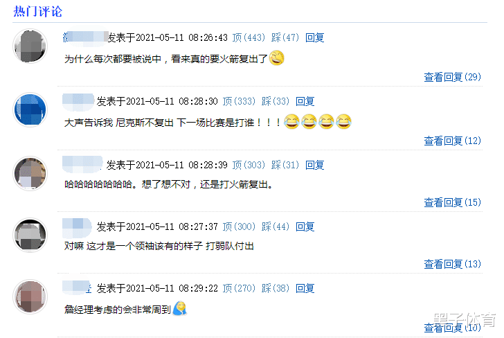 热门评论都是讽刺詹姆斯打弱队才复出的:“为什么每次都要被说中,看来真的要火箭复出了”、“大声告诉我,尼克斯不复出,一场比赛是打谁!!!”、“哈哈哈哈哈哈哈。想了想不对,还是打火箭复出。”、“对嘛,这才是一个领袖该有的样子,打弱队付出”、“詹经理考虑的会非常周到”。