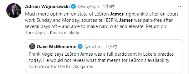 此前詹姆斯复出,但在加速突破和发力空切时感到疼痛,这是詹姆斯再次伤停的真因,如今这种后遗症已经不再困扰詹姆斯,这意味他已经无限接近痊愈。