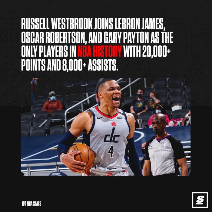 韦少比肩勒布朗-詹姆斯、大O罗伯特森和加里-佩顿成为NBA历史第四位打成得分20000+助攻8000+的球员,不可思议的韦少太疯狂,对阵老鹰首节6投3中拿到10分4助攻2篮板,若今天再次拿到三双,他将会正式超越大O成为NBA历史三双王。