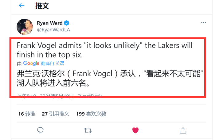 JRS直播网讯 北京时间5月10日,湖人主场迎战太阳,在这场比赛前,湖人主帅沃格尔在接受采访时承认,球队“看起来不太可能”以西部前六的战绩直接打入季后赛!