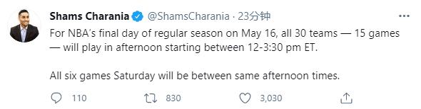 JRS直播网讯 北京时间5月10日,名记Shams在个人社媒上爆料了NBA常规赛最后两个比赛日的赛程安排,这个密集程度堪称恐怖。