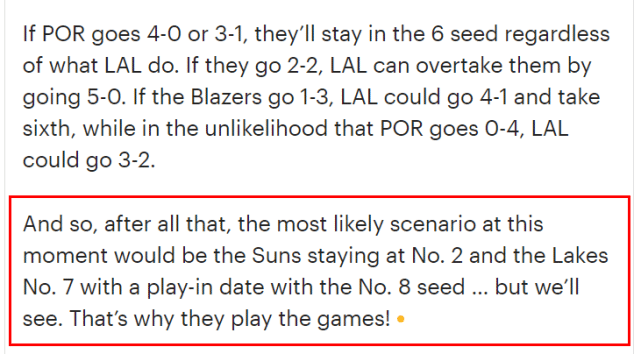 如果开拓者打出4胜0负或者3胜1负,他们就能至少确保在第六,无论湖人打出怎样的战绩。如果开拓者2胜2负,湖人5胜0负就能超过开拓者。如果开拓者1胜3负,湖人4胜1负就能拿到第六;当然还有更小可能性的就是开拓者余下4场全败,湖人3胜2负也能超过开拓者。