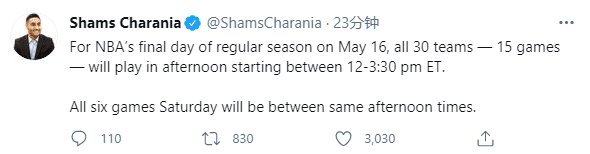 JRS直播网讯 北京时间5月10日,NBA常规赛收官战计划曝光,据名记Shams报道,常规赛最后一天(北京时间5月17日)30支球队全部有比赛,且全部都在北京时间凌晨0点-3点半打响;15场比赛全在同一时段开打,这下中国球迷又要熬夜了。