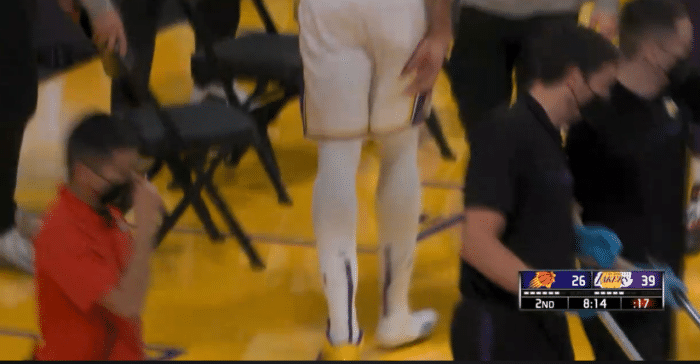 JRS直播网讯 北京时间5月10日,湖人和太阳比赛中,詹姆斯坐在场边为队友鼓劲,浓眉延续火热手感,半场15投8中拿到22分5篮板1盖帽1助攻,在场正负值+17,浓眉把鞋都拼掉了;詹姆斯关心浓眉,多次走到浓眉面前和他互动,期待湖人双巨再次合体。