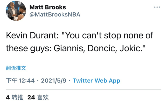 比赛结束之后杜兰特接受采访,他盛赞了对手掘金的核心约基奇,此役约基奇砍下29分7篮板6助攻,而且基本上预定常规赛MVP,杜兰特称:“你无法去阻止这些家伙:字母哥,东契奇,约基奇。”