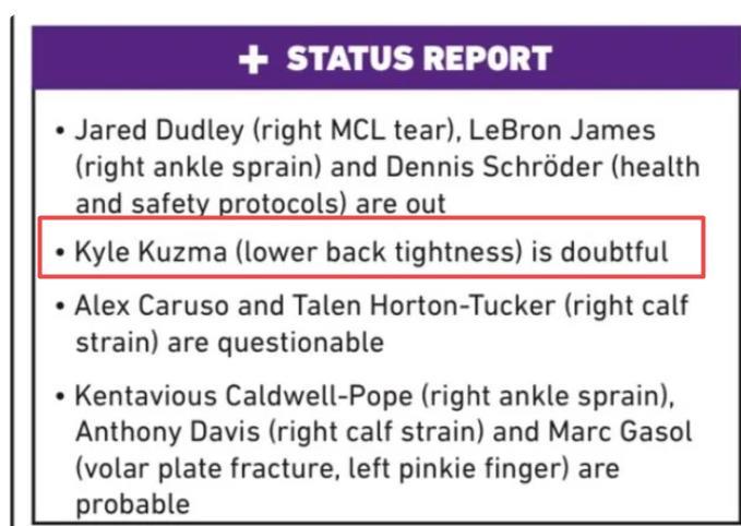 这个成绩单也被湖人的球迷怒骂,不过现在也不用骂了,根据湖人队更新的球员伤病情况,在接下来对阵太阳队的比赛,除了詹姆斯依旧缺席,塔克出战成疑之外,库兹马显示的状态也是出战成疑,帅小伙大概率将缺席对阵太阳队的比赛,如果库兹马再缺席,湖人队这场比赛几乎是提前认输,想要击败如今火热的太阳几乎是不太可能的事情。
