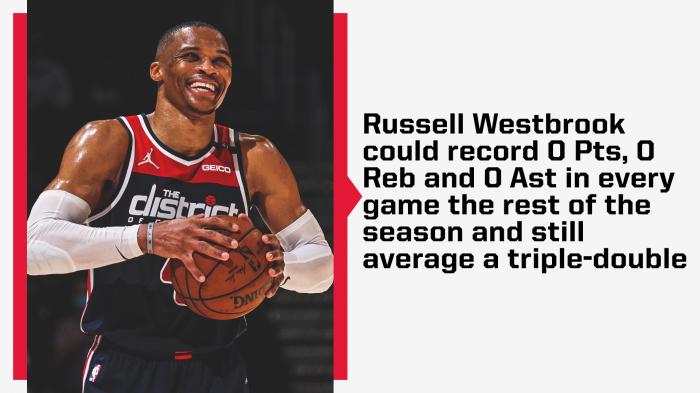 本赛季为奇才出战59场,韦少疯狂轰下33次三双,平均不到两场就会拿到一次三双;奇才还剩下6场比赛,不出意外的话,韦少将会追平甚至超越罗伯特森,毕竟他距离超越大O仅差3次三双;值得一提的是韦少常规赛+季后赛总共189次三双,正式追平大O并列历史第一。