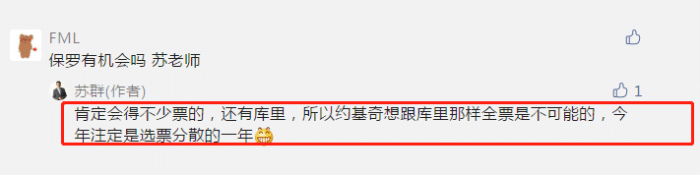 可以看出,在苏老师看来,赛季最大的个人奖项,已经提前几场结束悬念,约基奇加冕只是迟早的问题。不过,苏群在和球迷互动中,也同样认为,约基奇不可能拿到全票MVP。有球迷提问,“保罗还有机会吗”。