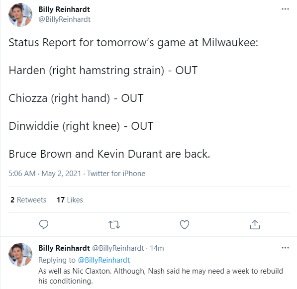 篮网跟队记者表示,杜兰特和布朗确定能打明天的比赛,但克拉克斯顿的情况不确定,毕竟,之前纳什曾表示他预计用一周的时间帮助克拉克斯顿恢复状态,当然,也不排除篮网以赛代练,让这位小将在比赛中找回节奏。