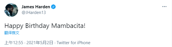 篮网球星哈登也发声,寄托思念之情,发推写道:生日快乐!小曼巴(Mambacita,Gigi的昵称)。