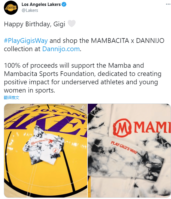 湖人官方晒照,把Gigi纪念服放在斯台普斯球馆的湖人logo处,发推写道:Gigi生日快乐;与此同时,湖人队宣传这款衣服,希望大家购买这款运动装,销售的所有收入都属于曼巴体育基金,用于公益事业。