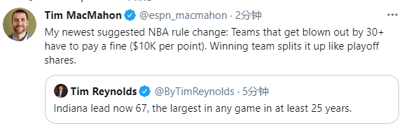 步行者57分屠杀雷霆引热议,最多领先67分,名记麦克马洪发推写道:建议NBA改变规则,一支球队狂输30+必须罚款(每一分罚款1万美元);美媒晒表情包,恶搞看到如此巨大分差的反应。
