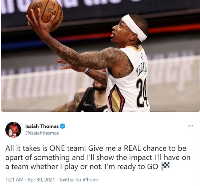 4月4日,小托马斯得到了鹈鹕的一份临时工合同,不过十天之后,鹈鹕没有留下小托马斯,近日,小托马斯在自己的社交媒体上发言:我只需要一支球队,给我一次真正的机会,成为其中一份子,无论是否上场,我会展示出自己的影响力,我做好准备了。