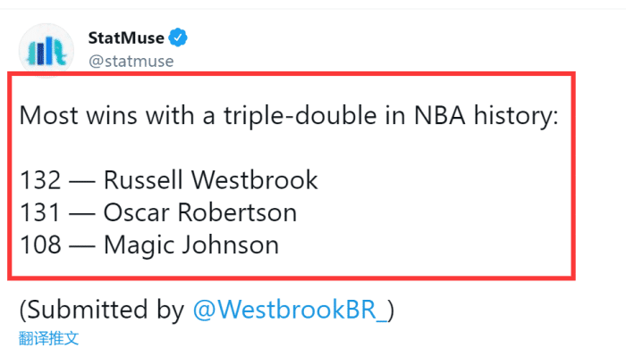 可是,据美媒statmuse统计,韦少目前在个人拿到的176次三双中,其中有132次拿到了胜利,超越大O罗伯特森的131次来到NBA历史第一!换句话说,韦少的三双胜率其实是比罗伯特森要高的,目前神龟的三双胜率刚好是75%,而大O三双胜率是72.4%!