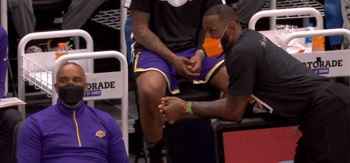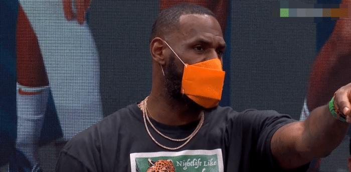 詹姆斯身穿黑色T恤和黑色短裤,戴着橘黄色的口罩,继续随队出征客场;虽然因伤休战,但詹姆斯一直都是摄像师抓拍的焦点人物,现场镜头经常抓拍詹姆斯。