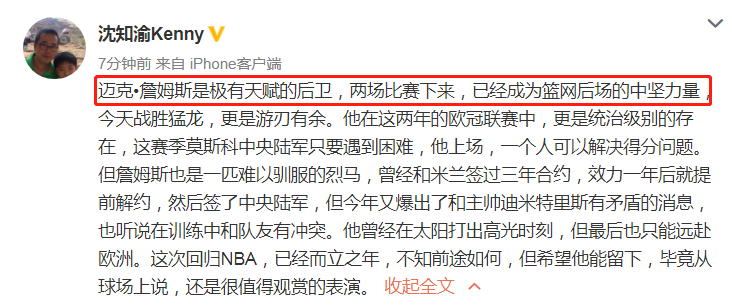 而篮球评论员沈知渝则盛赞了篮网新援迈克詹姆斯,他认为迈克詹姆斯已经成为篮网后场的中坚力量,而在欧洲打球时期,迈克詹姆斯极具统治力,不过,迈克詹姆斯可能也是一匹烈马,曾经和米兰提前解约,在中央陆军打球时期,又和主教练有矛盾。未来,迈克詹姆斯是否能顺利留队,让我们拭目以待。