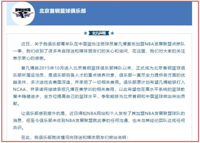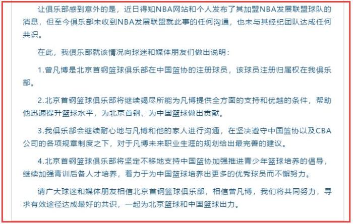 JRS直播网讯 曾凡博选择加盟NBA发展联盟选拔队一事,实际上是闹了一个不小的乌龙,而北京首钢官方也终于对此事进行回应!