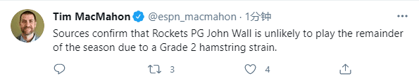 JRS直播网讯 北京时间4月27日,火箭核心球星约翰-沃尔提前赛季报销,据名记shams报道,火箭后卫沃尔因腿筋拉伤不会出战剩余的比赛,提前赛季报销;随后火箭记者麦克马洪证实,沃尔遭遇腿筋二级拉伤,本赛季不会再为火箭出战。此前篮网球星哈登也是因腿筋伤病而常规赛报销。