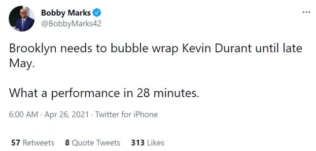 著名詹黑Skip写下推文“凯文杜兰特再次证明了他是地球上最好的球员,这个男人本赛季只打了24场球,今天回归就在28分钟内拿到了33分,篮网在没有哈登的情况下轻松击败了不开玩笑的太阳,拜托,盲目的见证者们,放弃吧,KD强于詹姆斯!”薪资专家鲍比马克斯“在五月下旬前,篮网都都得拿泡沫把杜兰特包好,28分钟内打出多么牛的表现啊!